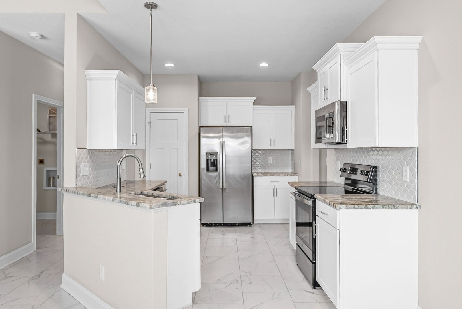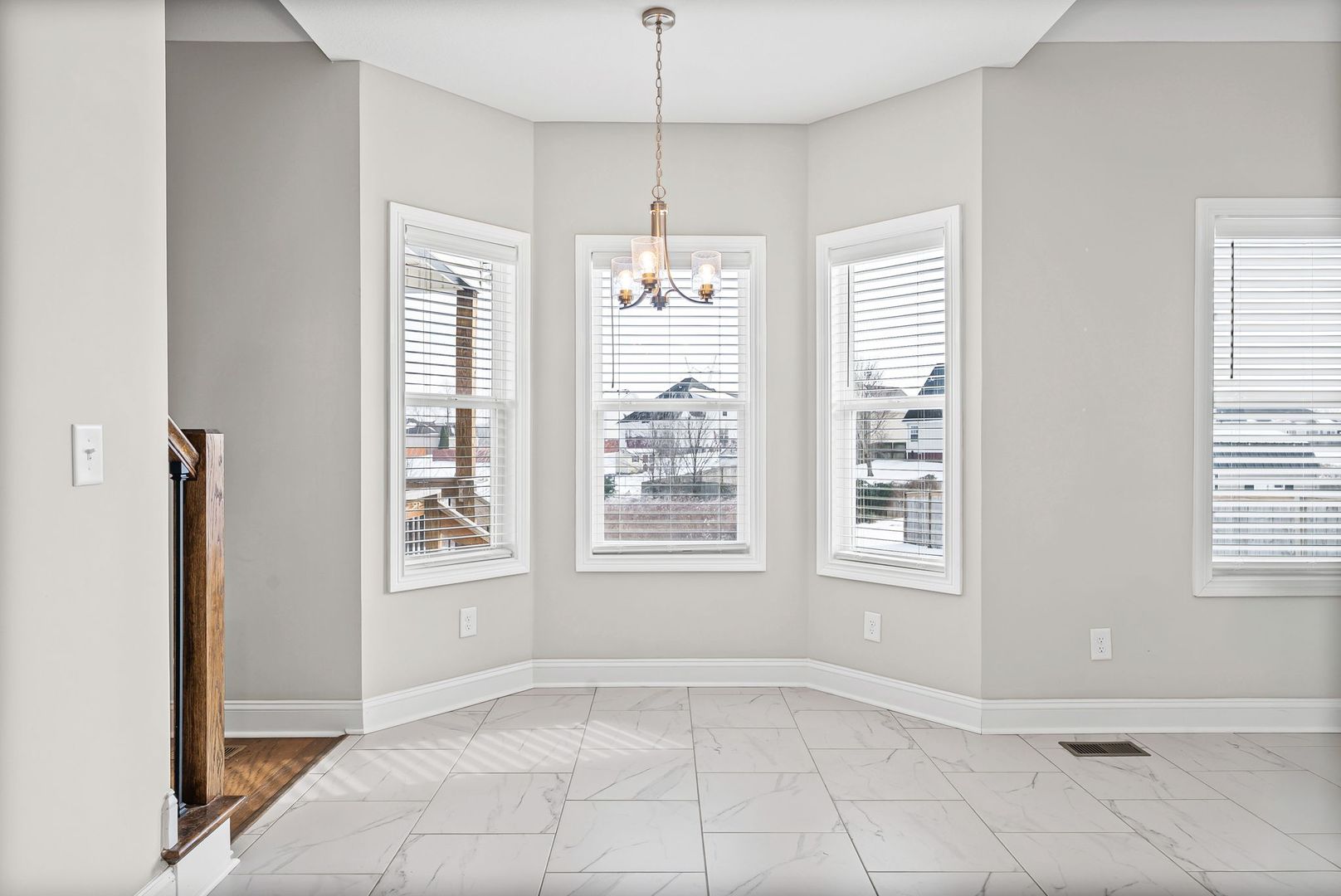 The living room features a cozy gas fireplace (tenant responsible for setup), creating a warm focal point for the home. The kitchen offers elegant marble countertops, ample cabinet space, and an additional dining area ideal for a breakfast table or casual seating.