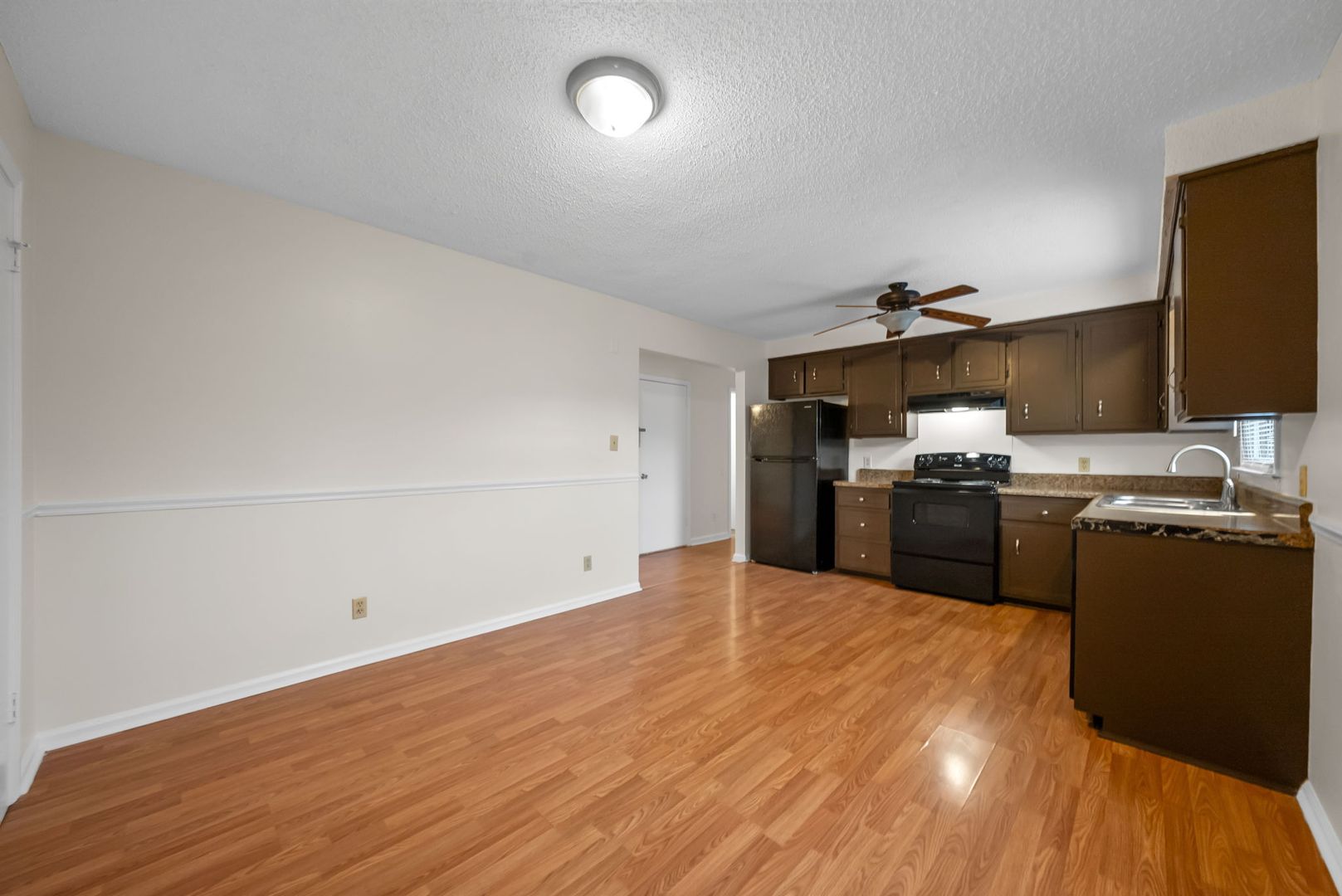 Step onto the inviting covered front porch, perfect for relaxing mornings or evening unwinding. Inside, you’ll find laminate flooring throughout and an open-concept living room that flows seamlessly into the eat-in kitchen. The kitchen boasts ample cabinet and counter space, along with a window overlooking the backyard that's a great touch for enjoying the view while washing dishes.