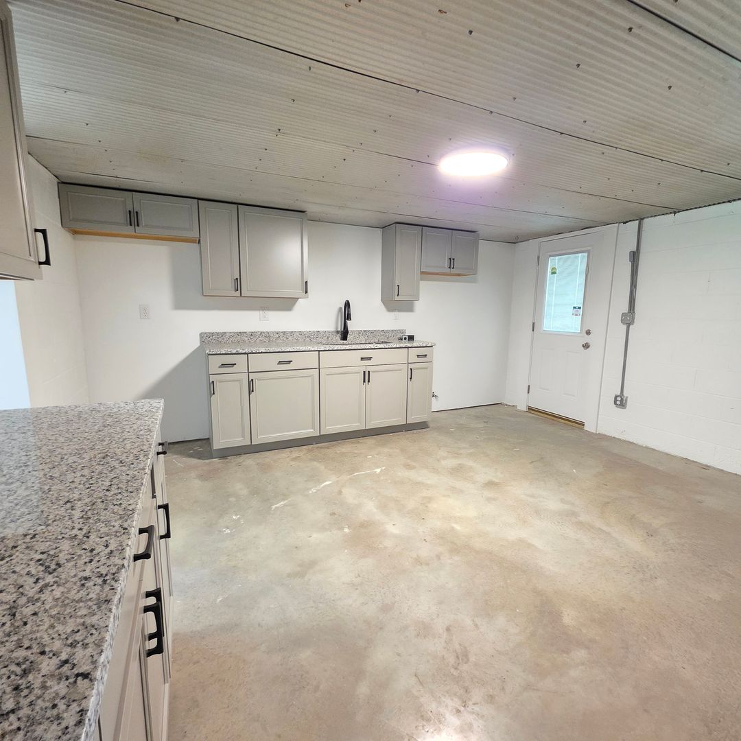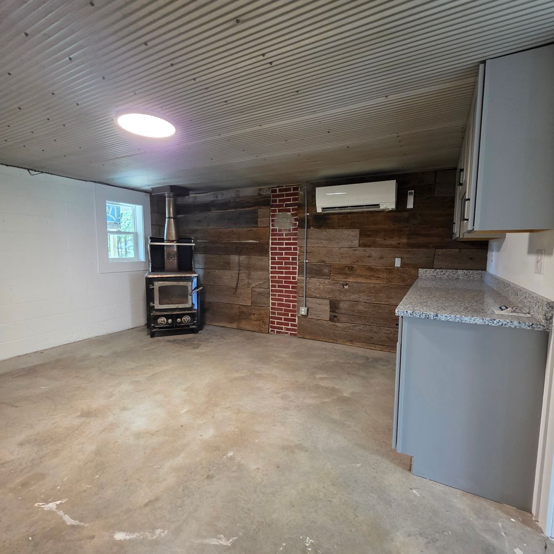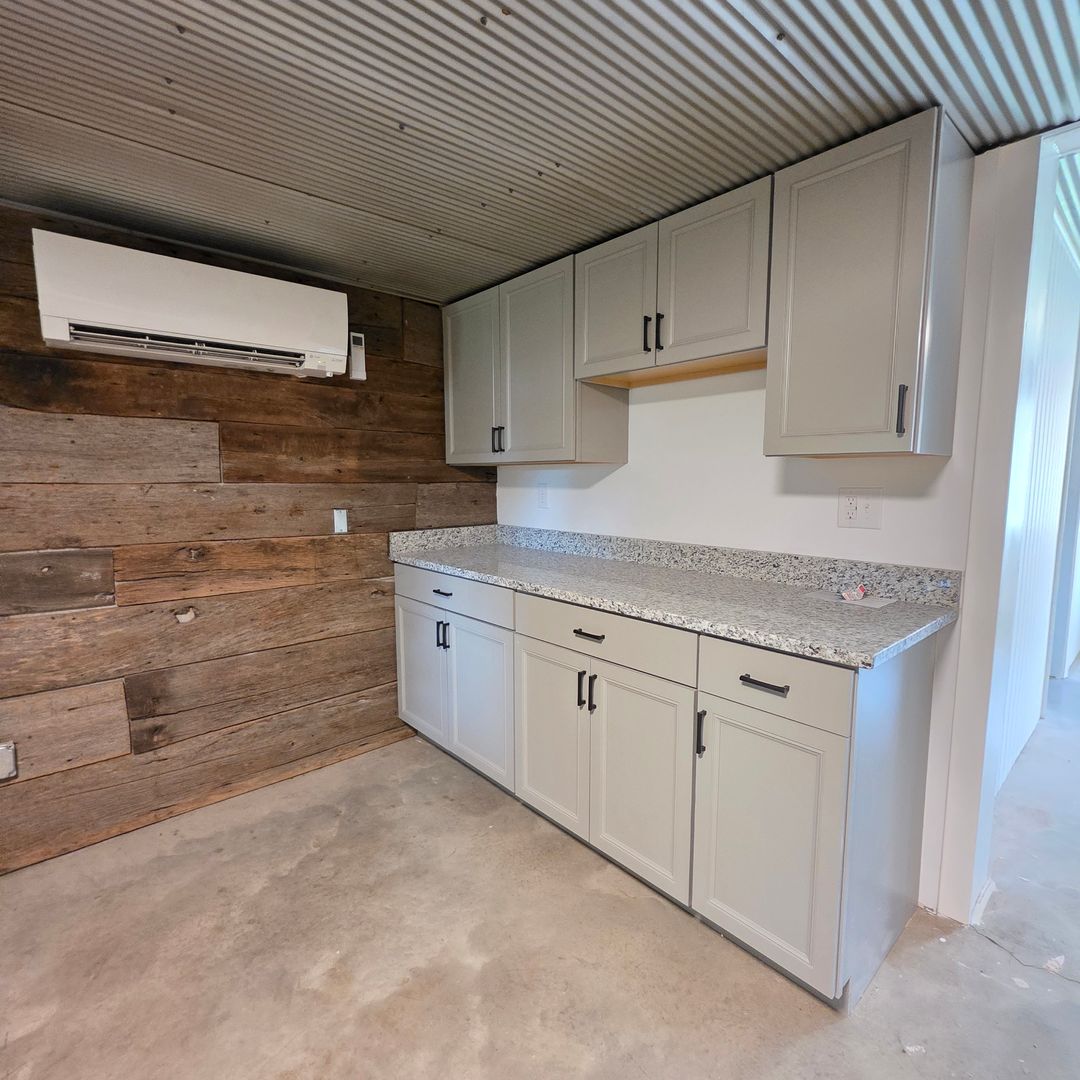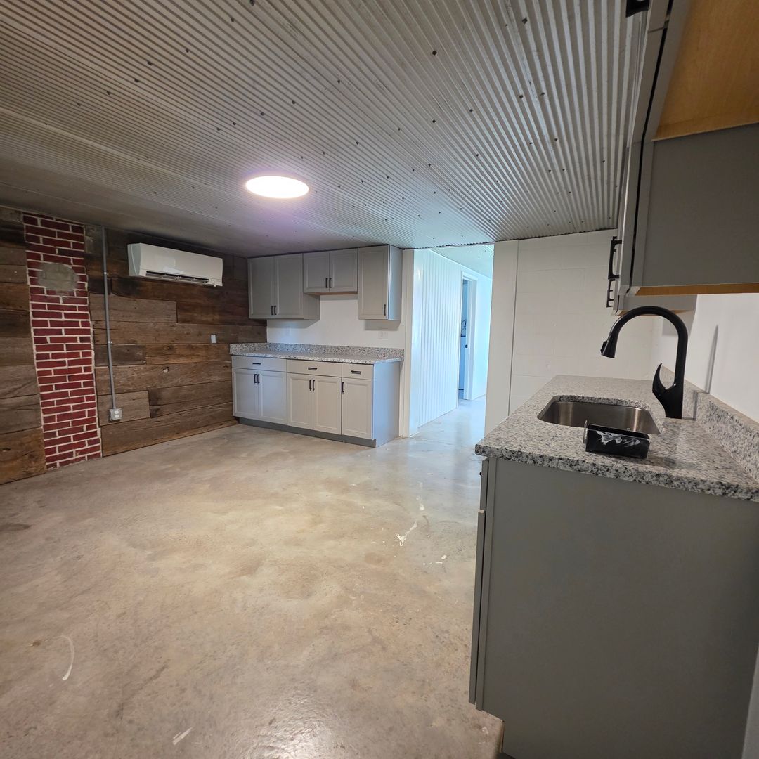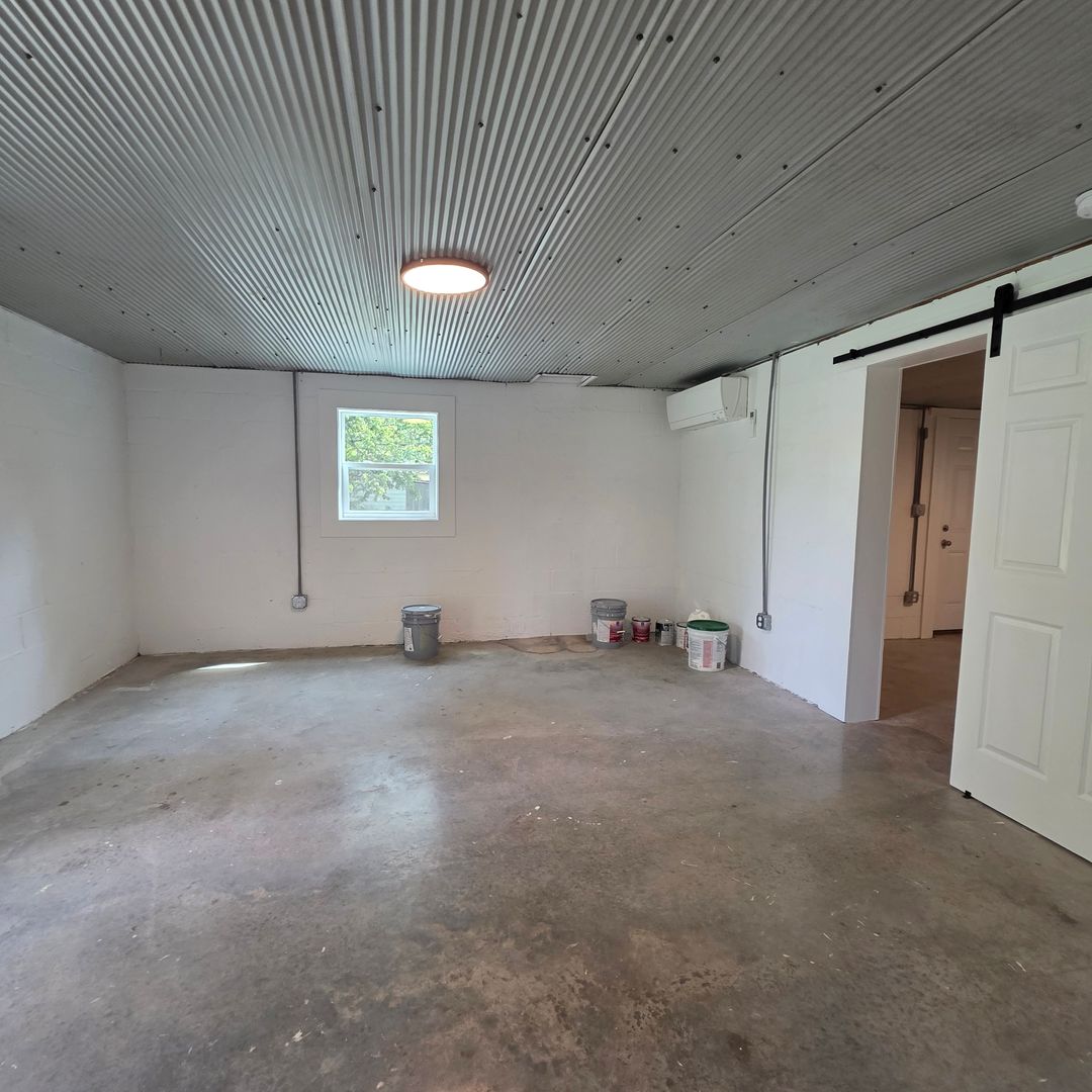 Inside, polished concrete floors and a sliding barn door create an industrial yet inviting aesthetic. The spacious kitchen is built for entertaining, featuring generous counter space, a functional layout, and a striking accent wall that adds character.