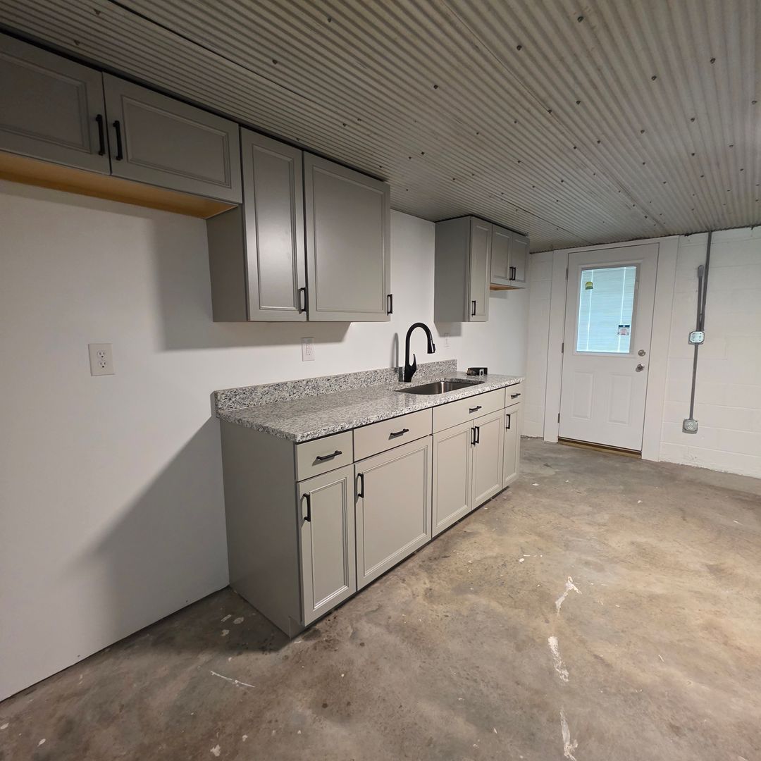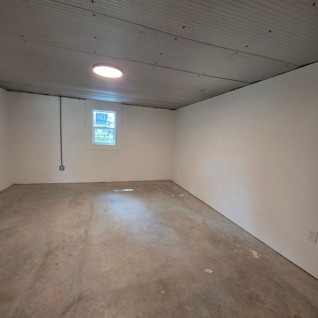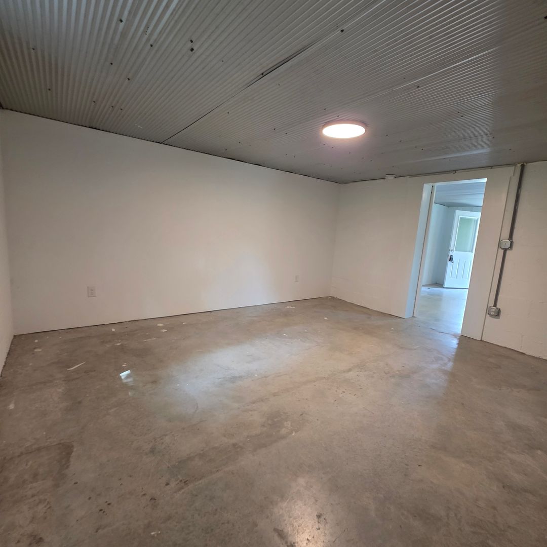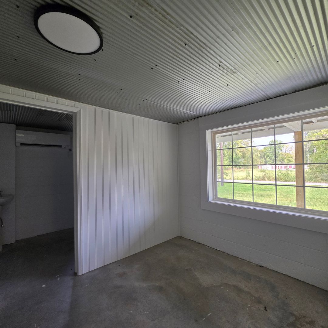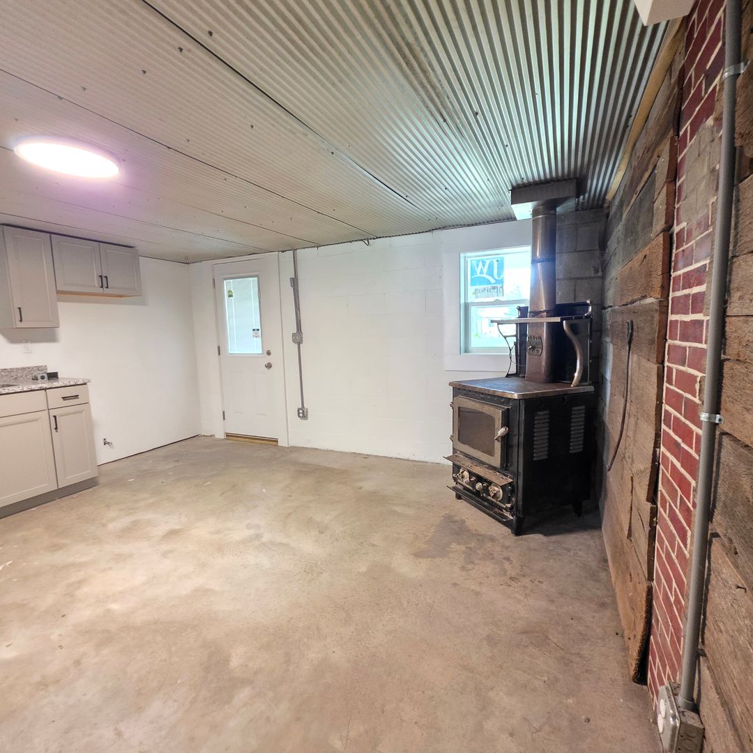 Inside, polished concrete floors and a sliding barn door create an industrial yet inviting aesthetic. The spacious kitchen is built for entertaining, featuring generous counter space, a functional layout, and a striking accent wall that adds character.