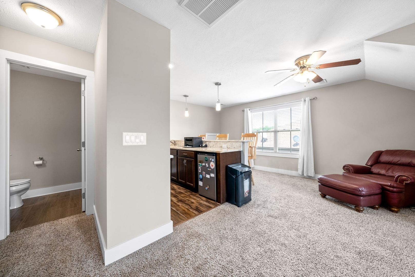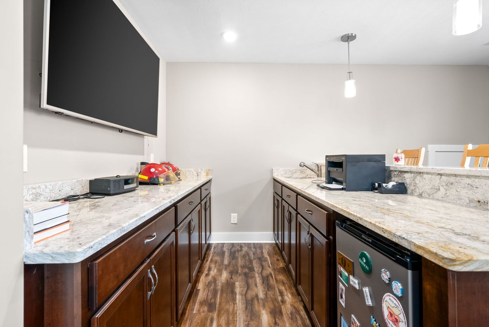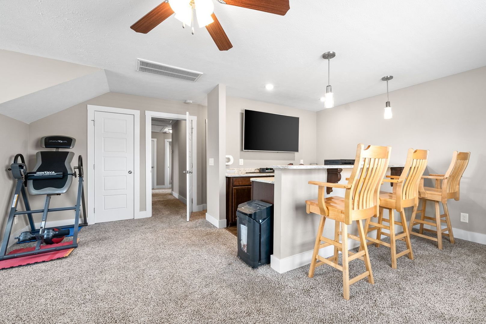 The living room showcases a custom ceiling design and built-in desk with cabinetry. Downstairs, the rec room is perfect for entertaining and includes a built-in bar with granite countertops, an additional half bath, and two storage closets. Upstairs, you’ll find additional bedrooms and a full bathroom.