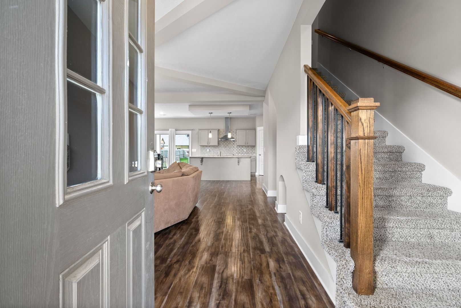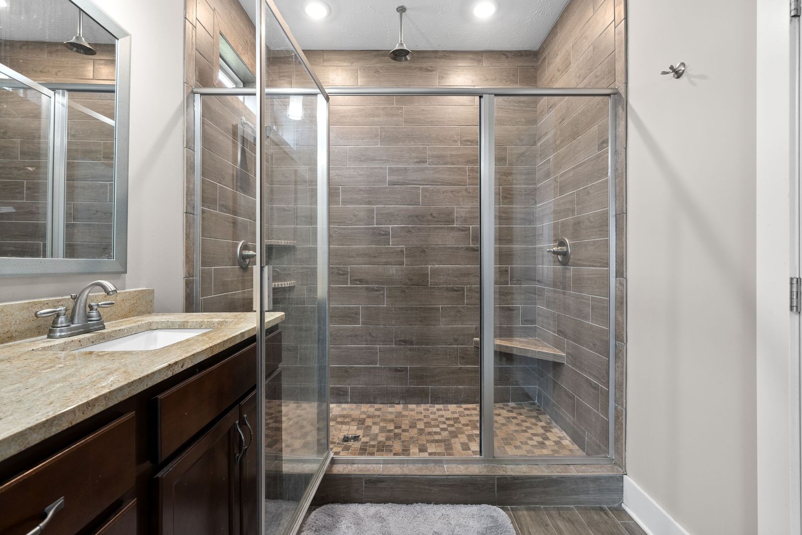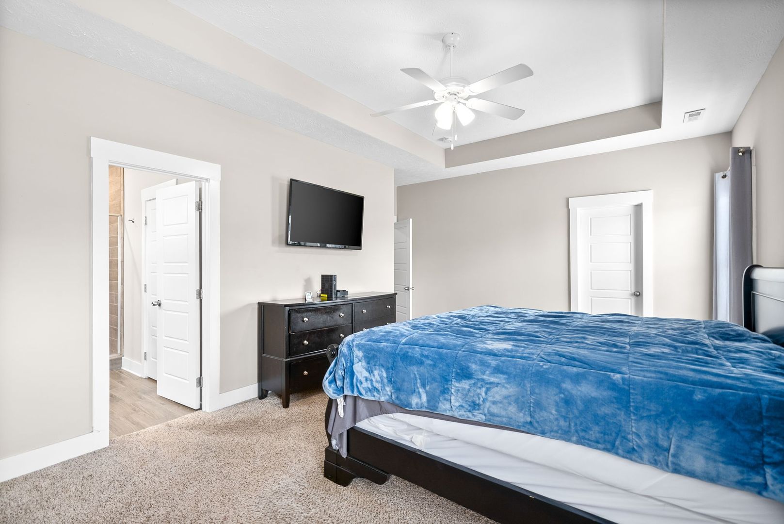 The living room showcases a custom ceiling design and built-in desk with cabinetry. Downstairs, the rec room is perfect for entertaining and includes a built-in bar with granite countertops, an additional half bath, and two storage closets. Upstairs, you’ll find additional bedrooms and a full bathroom.