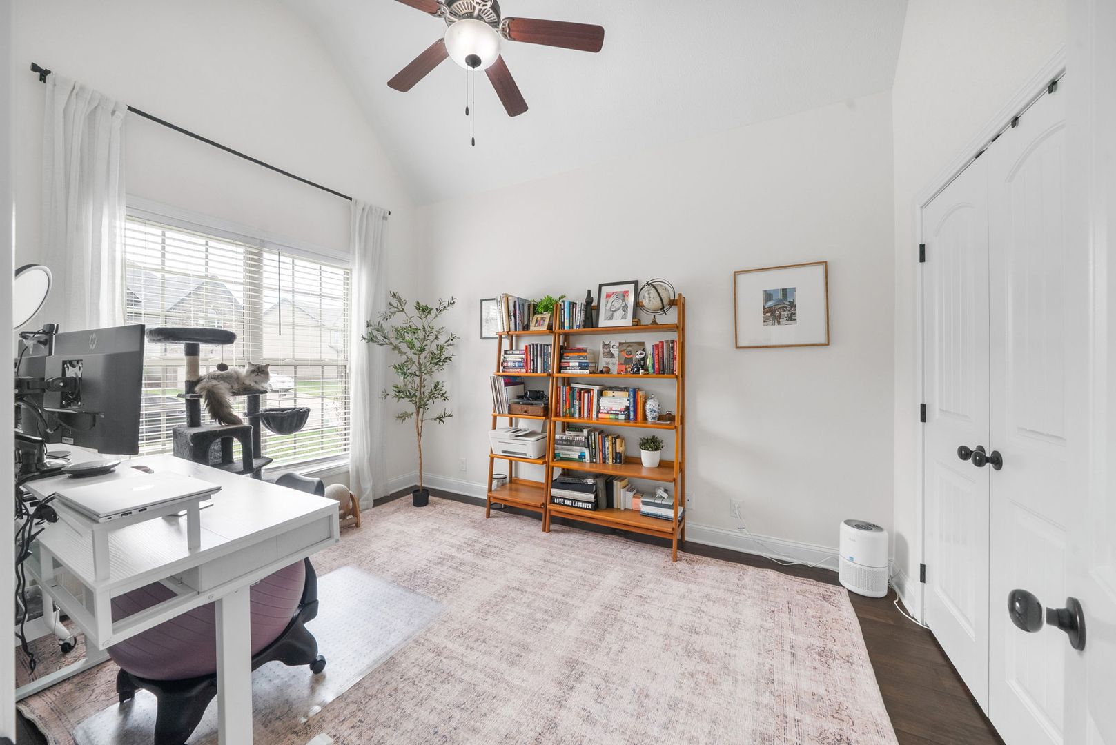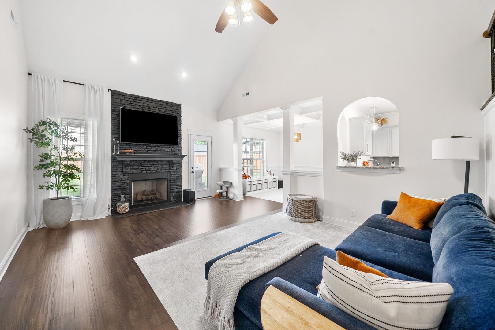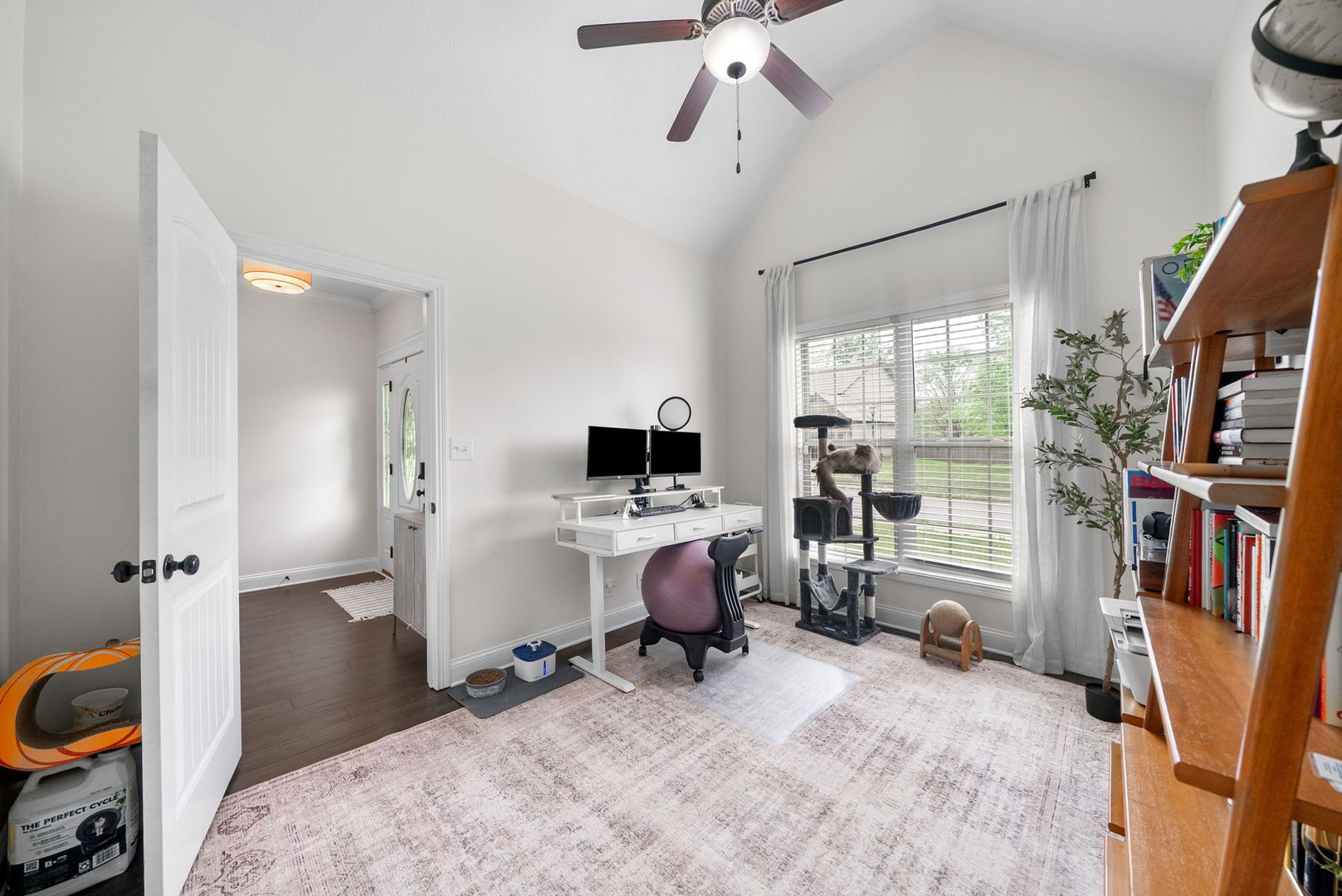 Step inside to find vaulted ceilings and an electric fireplace that create a warm and inviting living space. The home also features a formal dining room, perfect for hosting gatherings or enjoying family meals. The kitchen is designed for both style and function, featuring granite countertops, ample cabinet space, and a pass-through window for added convenience. The primary suite is located on the first floor, along with an additional bedroom, offering flexible living options. Each bedroom is equipped with ceiling fans for added comfort.