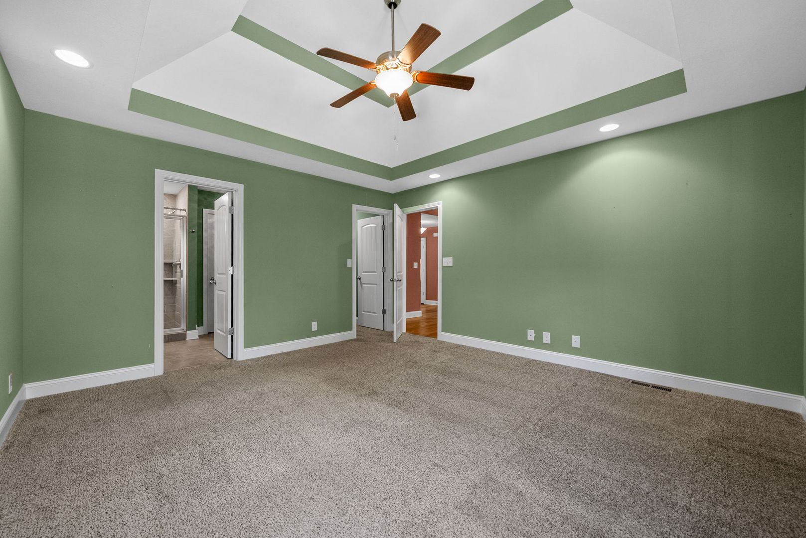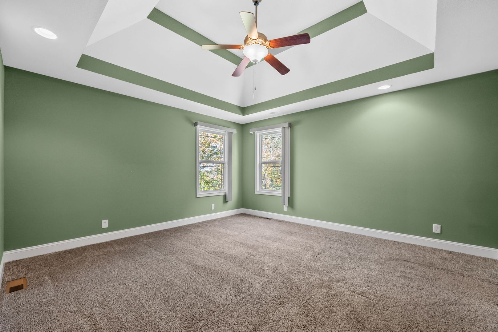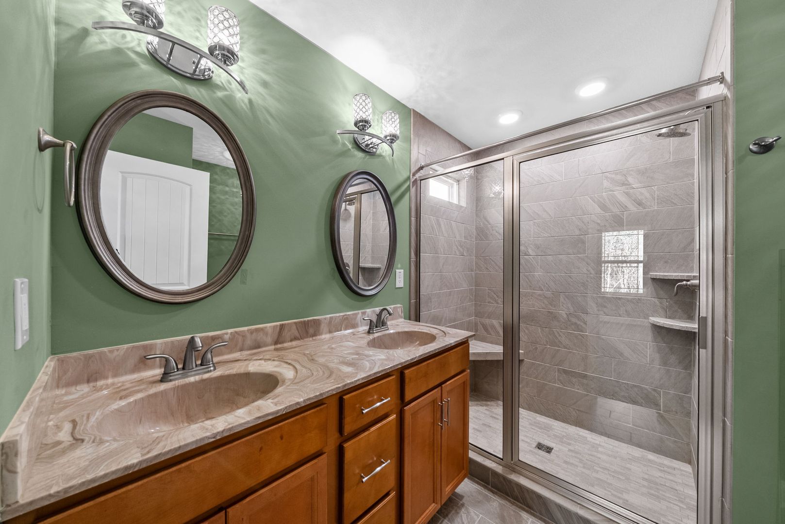 Retreat to the primary suite, highlighted by a vaulted ceiling, plush carpeting, and an en-suite bath with double sinks, a walk-in shower with built-in seating, and refined finishes.