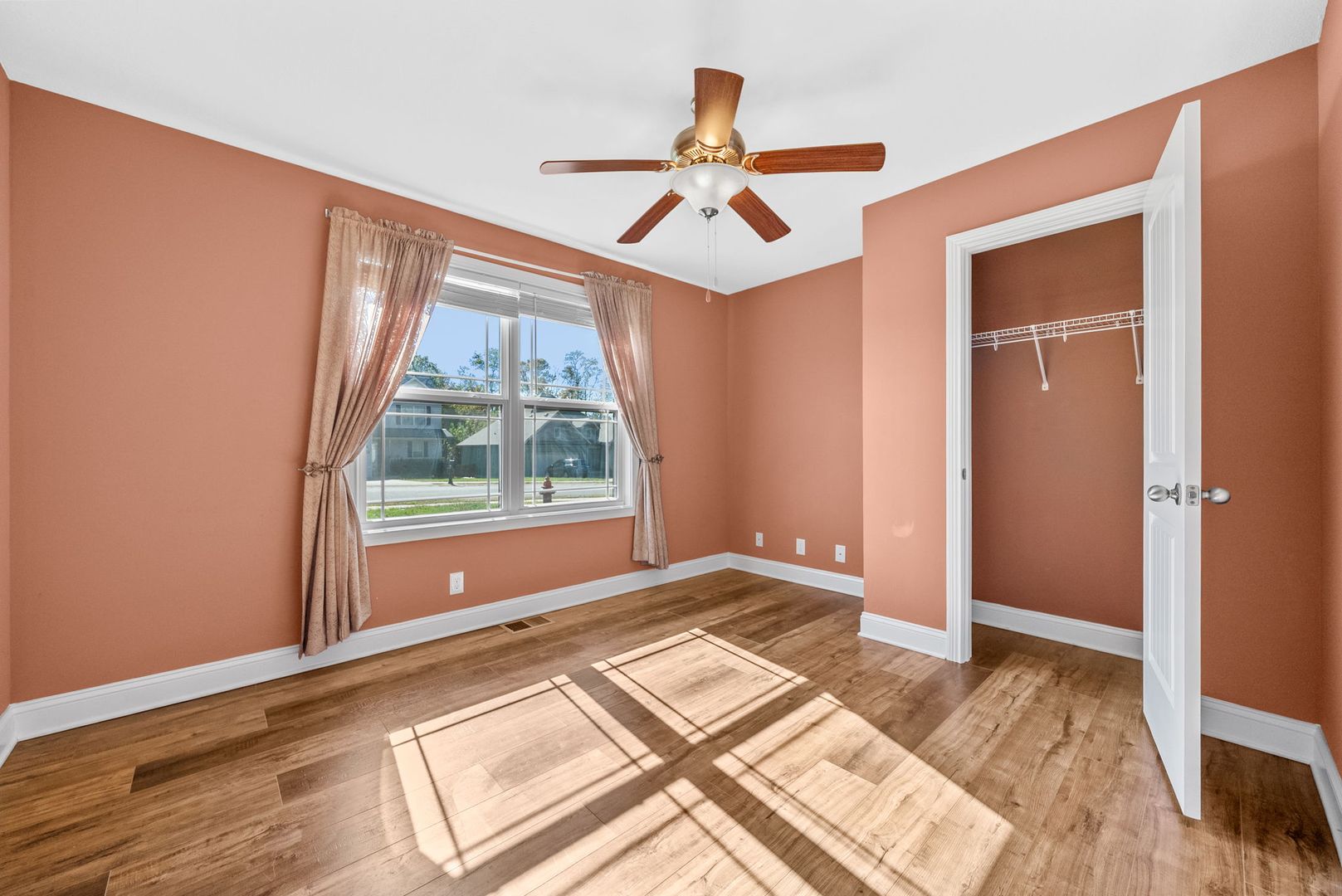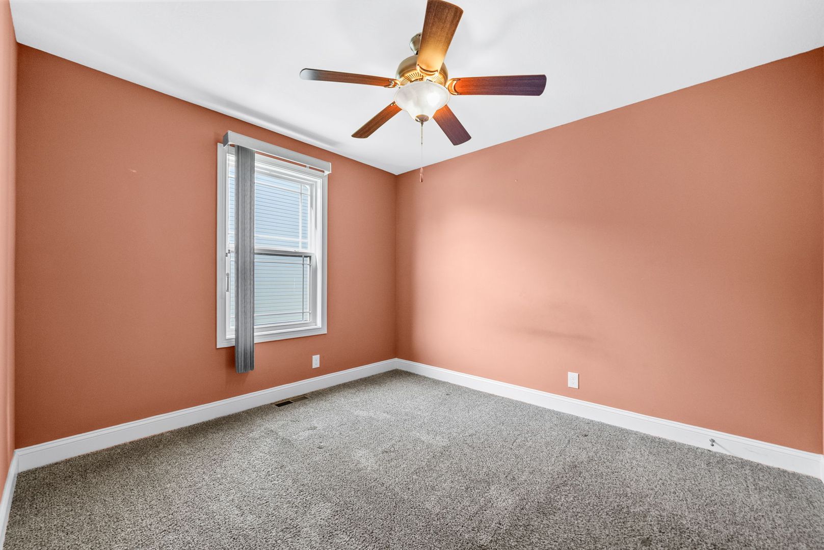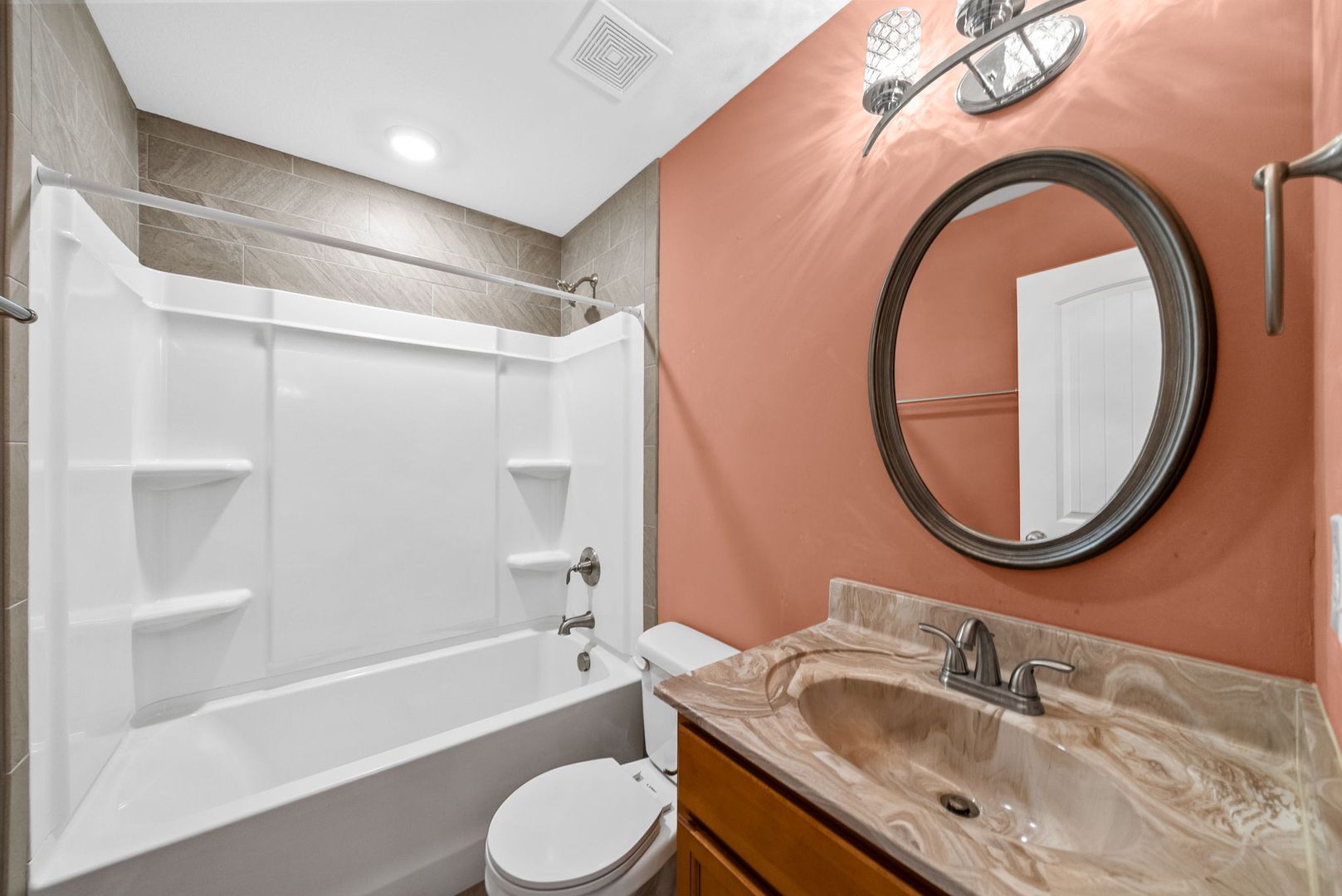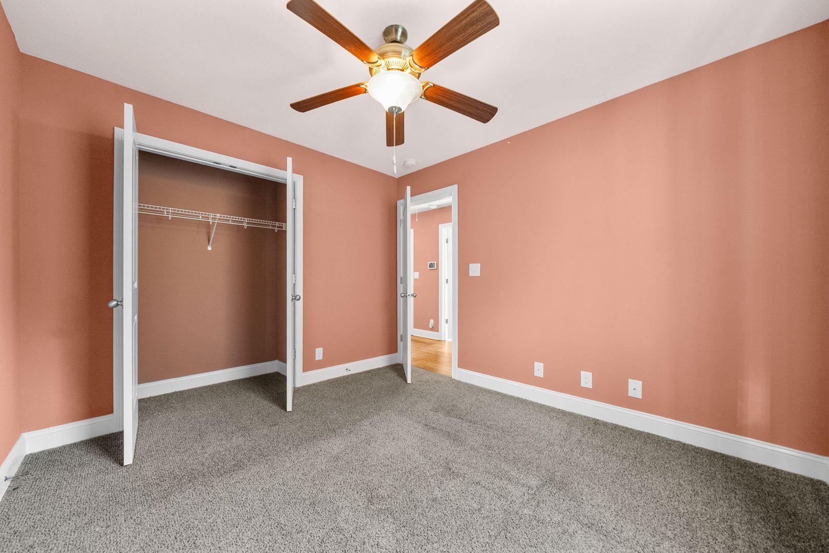 Retreat to the primary suite, highlighted by a vaulted ceiling, plush carpeting, and an en-suite bath with double sinks, a walk-in shower with built-in seating, and refined finishes.