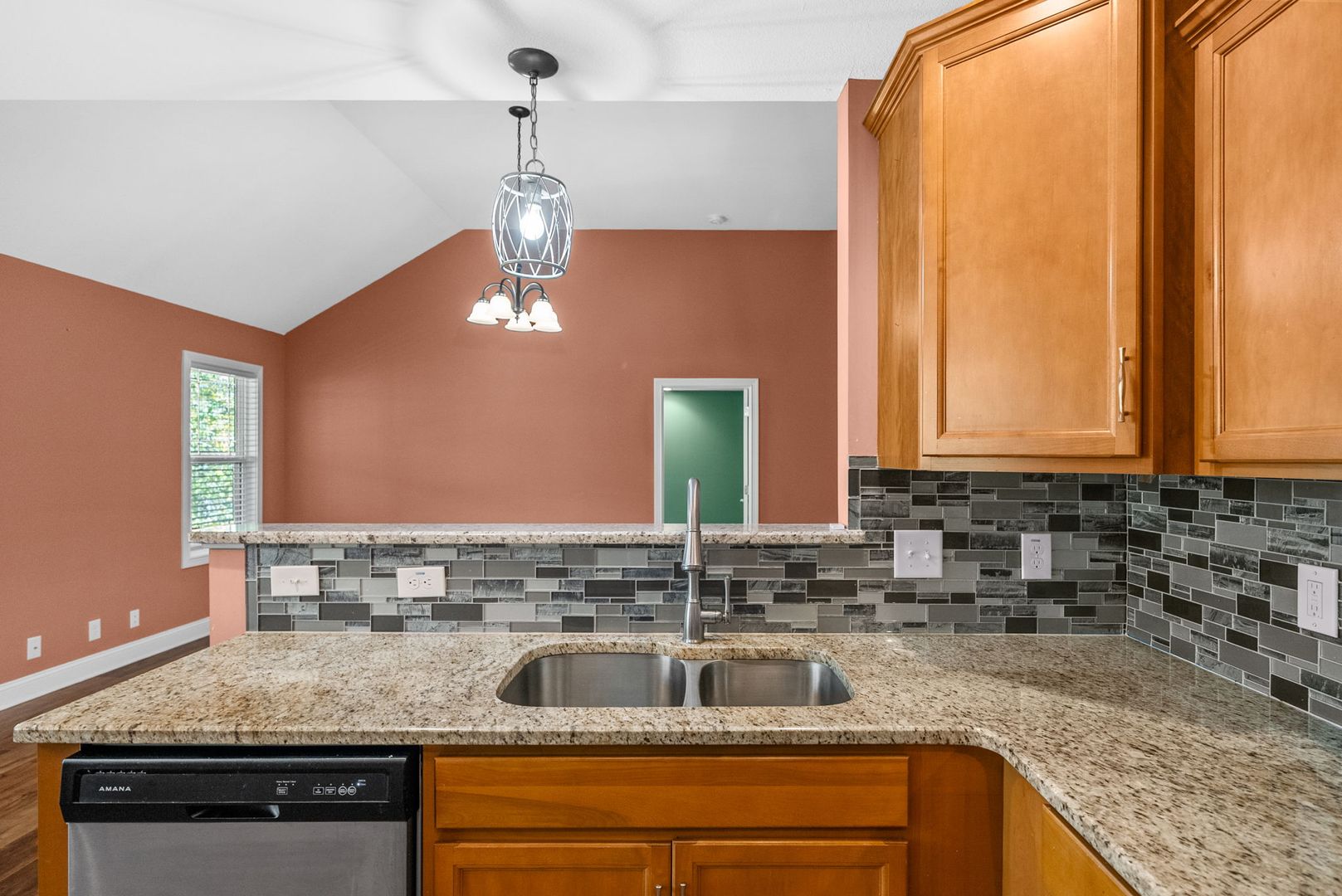 The kitchen showcases marble countertops, a sleek tile backsplash, stainless steel appliances, and plenty of cabinet space for all your essentials.