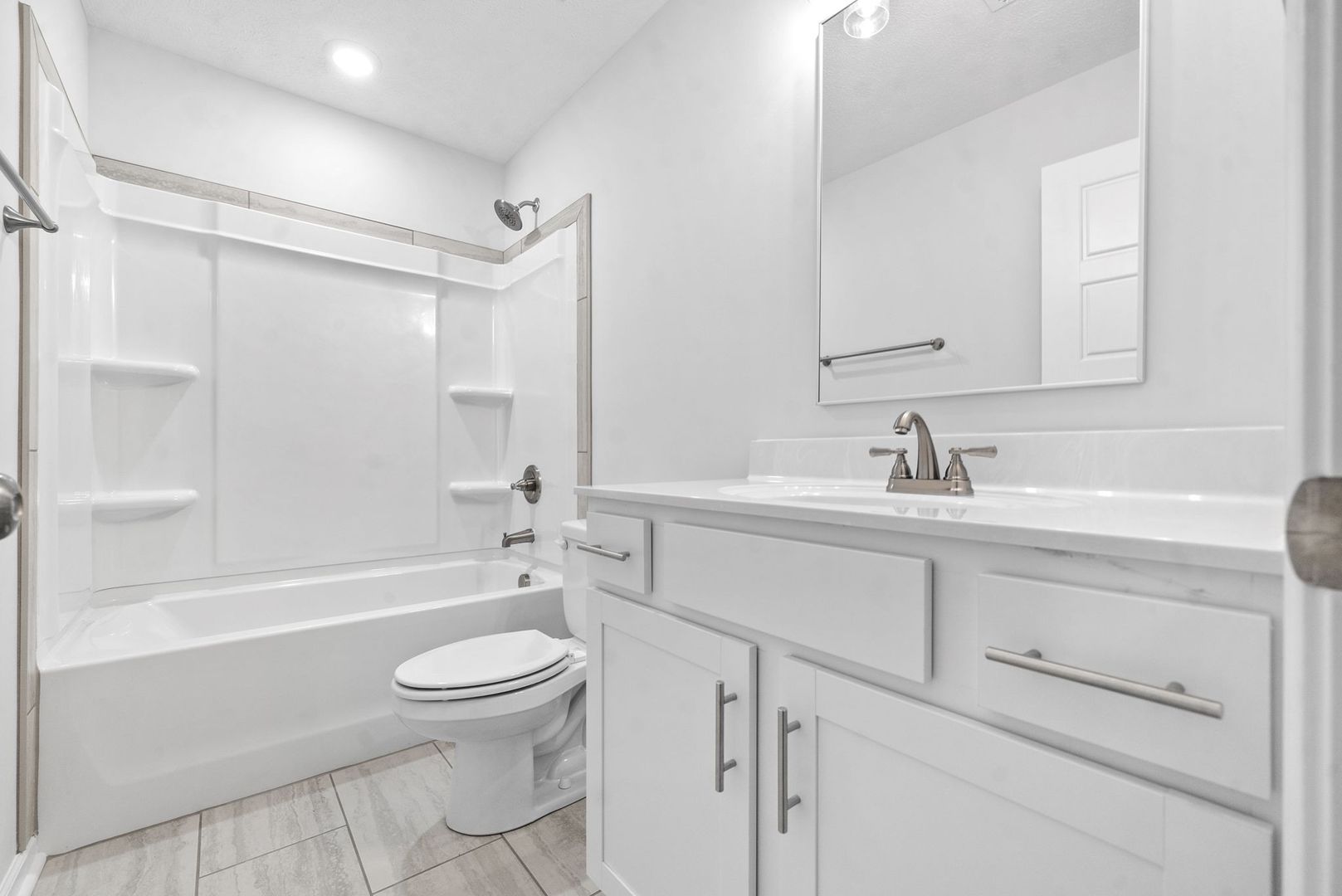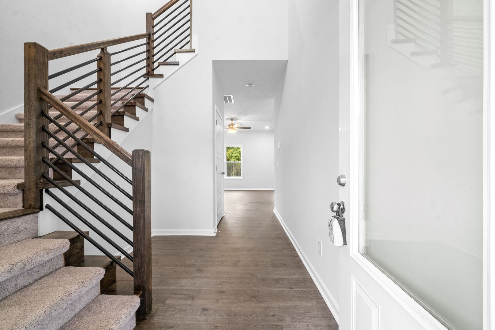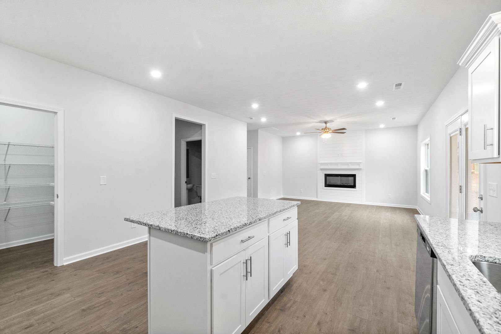The open-concept main living area connects the living room, dining space, and kitchen, creating a bright and welcoming environment that’s great for everyday living and entertaining. The kitchen features stainless steel appliances, a large center island, and an oversized walk-in pantry, offering plenty of storage and workspace. The living room is anchored by a beautiful shiplap fireplace, adding warmth and character to the space.